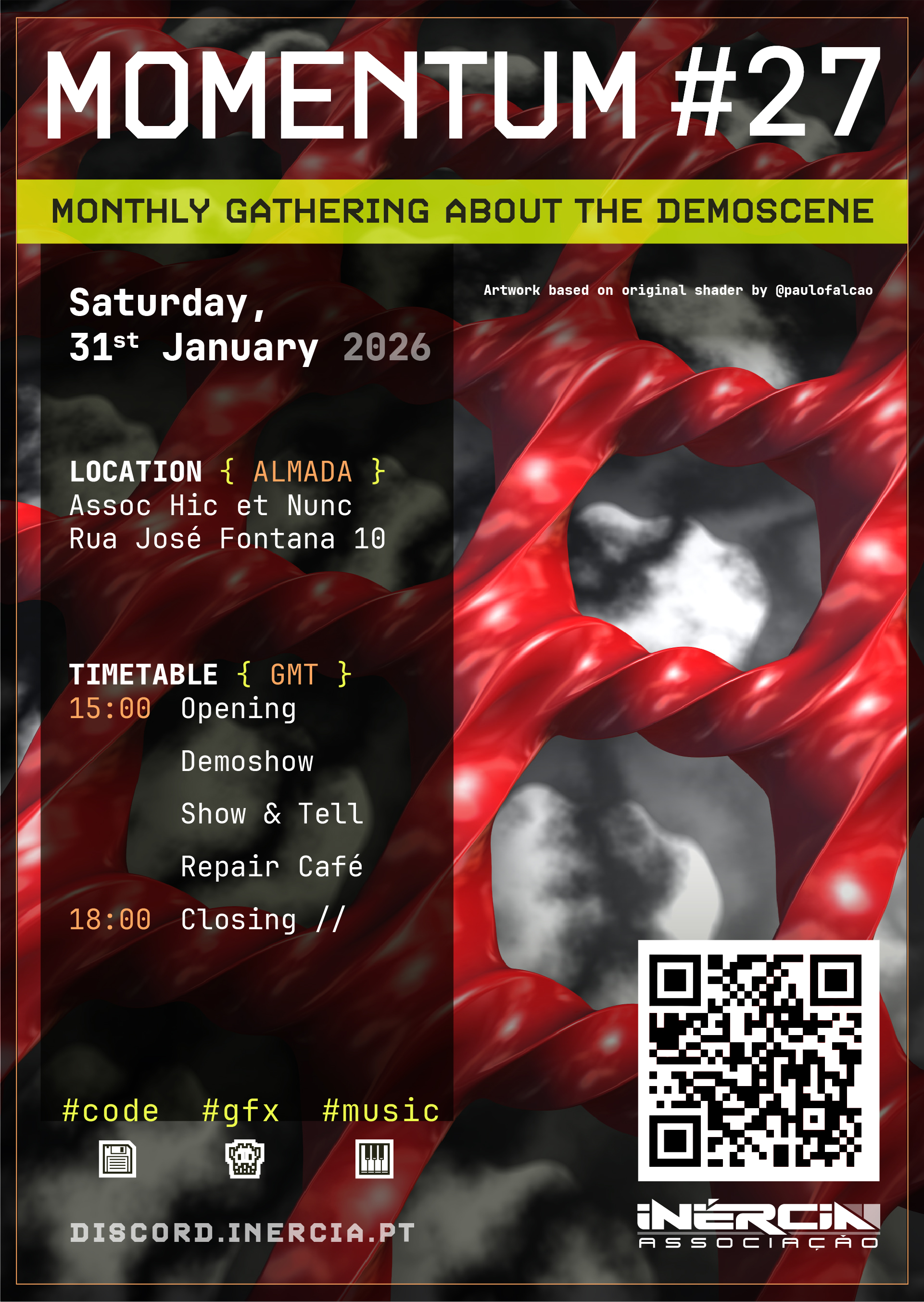 | O que é o Momentum | Organizado pela Associação Inércia. Encontro mensal de entusiastas da demoscene Portuguesa. Para os veteranos é uma boa oportunidade de voltar ao activo, para as pessoas curiosas é uma oportunidade de conhecer melhor a comunidade activa da demoscene em Portugal. | |