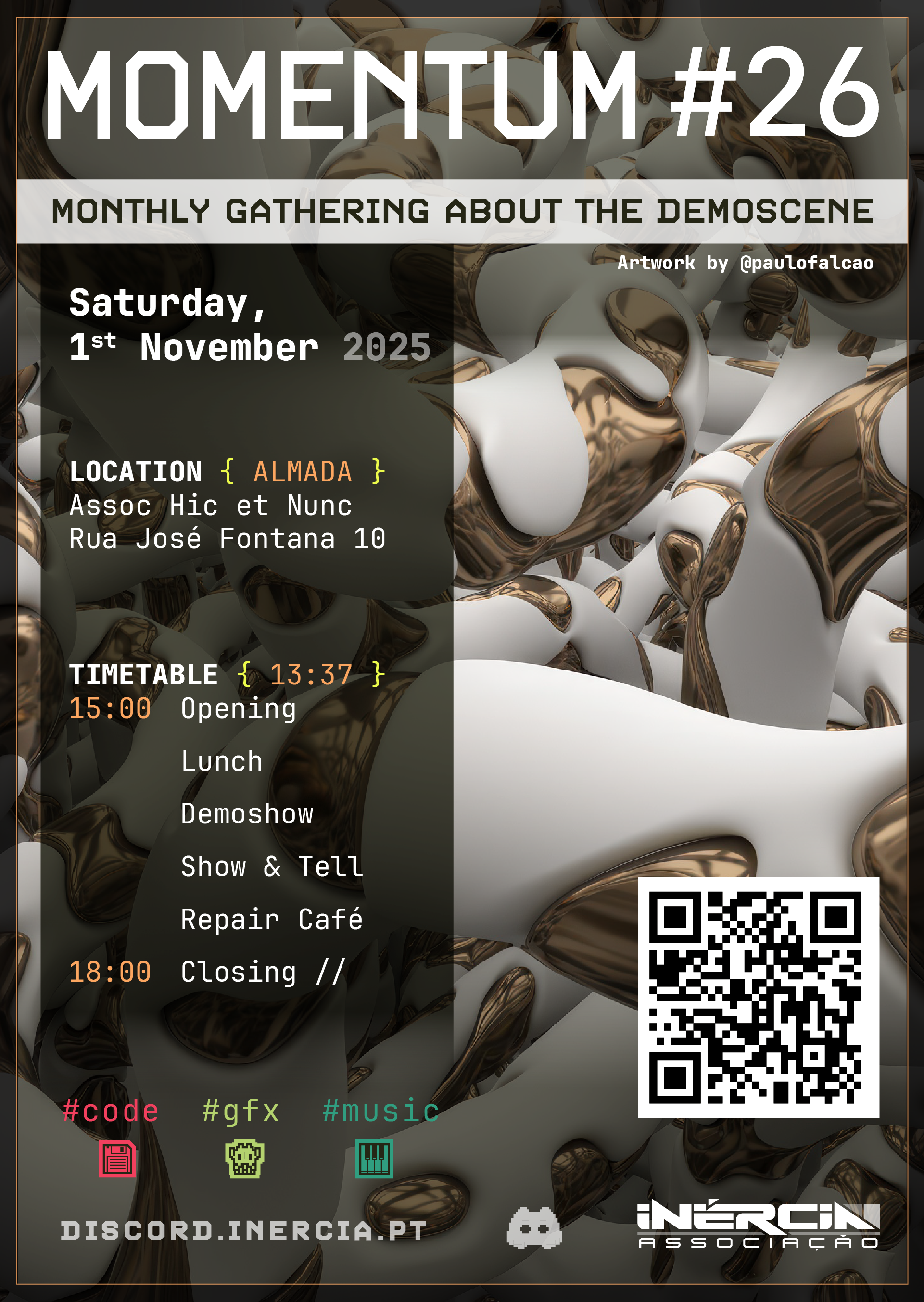 | O que é o Momentum | Organizado pela Associação Inércia. Encontro mensal de entusiastas da demoscene Portuguesa. Para os veteranos é uma boa oportunidade de voltar ao activo, para as pessoas curiosas é uma oportunidade de conhecer melhor a comunidade activa da demoscene em Portugal. | |